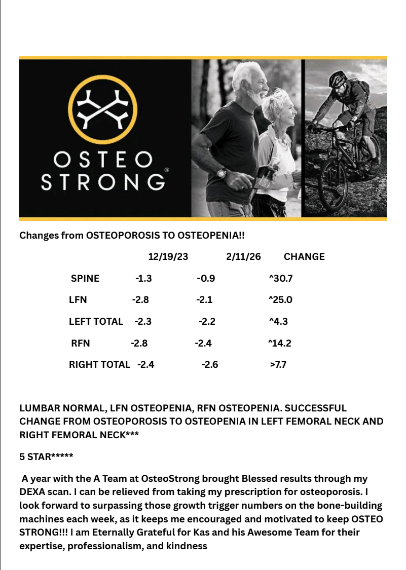 ** No physical exercise is 100% safe, and neither is OsteoStrong. OsteoStrong provides a unique way to emulate high-impact force loading to achieve osteogenic loading, without the high impact. Although not 100% safe, OsteoStrong is significantly safer than attempting high-impact force. OsteoStrong members have reported improved bone density, balance, strength, joint pain, and HbA1c. Results may vary. Consult your doctor. Statements have not been evaluated by the FDA and are not intended to diagnose, treat, cure, or prevent any disease or health condition. OsteoStrong centers are independently owned and managed. The OsteoStrong Scientific Advisor obtained his PhD from Rushmore University, certified/accredited to UK National Standards, but whose accreditation is not recognized in some jurisdictions. All rights reserved.